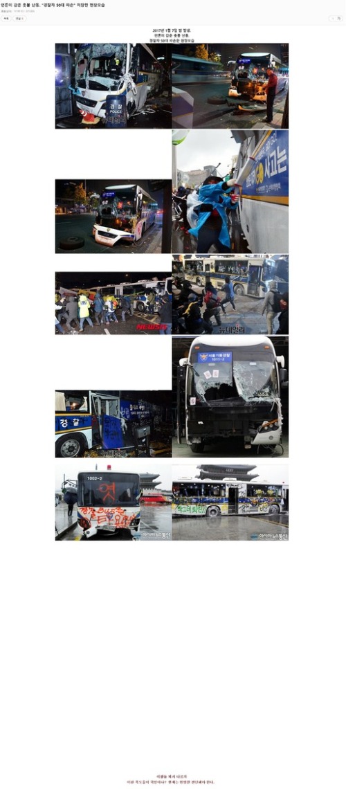 경찰 버스가 처참하게 부서진 사진, 시위 참가자들의 폭력적인 모습 등을 담은 사진 16장이 첨부된 글이었다.