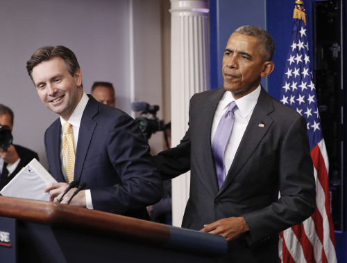 오바마 대통령은 "그는 대단한 대변인이었을 뿐만 아니라 진실로 좋은 사람이다. 나는 그가 정말로 자랑스럽다"고 강조했다. 이어 옆에 서 있던 어니스트 대변인과 뜨거운 포옹을 나눴다.