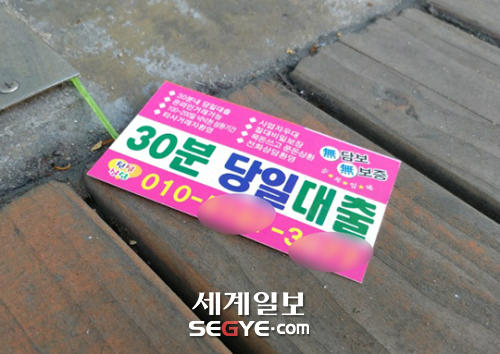 서울 시내 좁은 골목길을 걷다 보면 요리조리 빠르게 내달리는 오토바이를 심심찮게 볼 수 있다. 검은 마스크와 헬멧으로 무장한 채 오토바이에 올라탄 이는 운전하면서도 쉴 새 없이 명함 크기의 대출 전단을 무차별적으로 도로 옆 상가와 인도 등을 향해 던진다.