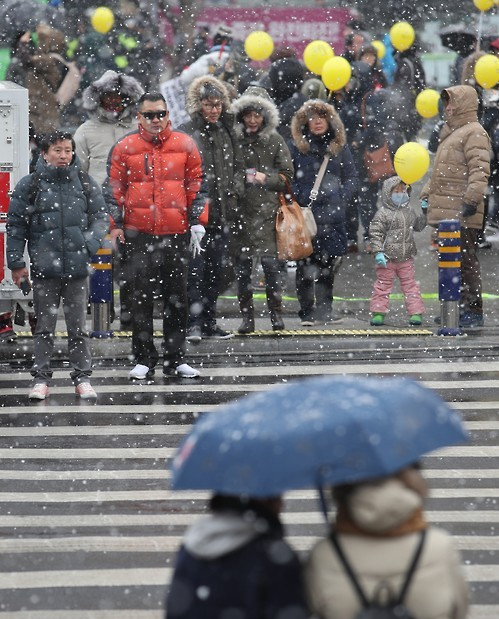 21일 눈발이 날리는 영하의 날씨 속에 서울 광화문 광장과 서울시청에 모인 시민들은 극명한 대조를 보였다. 광장 쪽은 명절을 앞두고 ‘설맞이 촛불’을 들었고, 시청에 모인 시민들은 현 탄핵 정국을 언론과 국회가 만들었다며 비난 수위를 높였다.