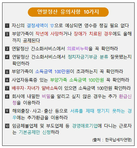 납세자 연맹 측은 연말정산 서류제출 전 아래 10개 항목을 주의해야 한다고 강조했다.