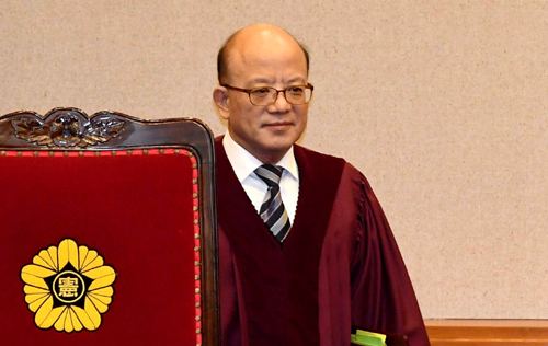 | 오는 31일 임기가 끝나는 박한철 헌법재판소장이 25일 재임 중 마지막이 될 박근혜 대통령 탄핵심판 변론 주재를 위해 헌재 대심판정에 들어서고 있다. 남정탁 기자 |