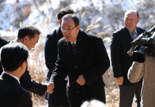 | 반기문 전 유엔사무총장이 설 당일인 28일 충청북도 음성의 선산을 찾아 성묘하기에 앞서 친척들과 인사를 나누고 있다. 연합뉴스 |