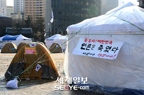 설 연휴 마지막 날인 30일 오전 서울 중구 태평로 서울광장에서 보수단체인 '대통령 탄핵기각을 위한 국민 총궐기 운동본부' 회원들이 천막을 치고 귀경길에 오른 시민들을 상대로 박근혜 대통령 탄핵 반대 여론전을 펼치고 있다. 한 회원은 “광화문 광장은 특정 단체의 것이 아니라며 세월호 천막이 철거될 때까지 노숙 농성을 이어가겠다”고 밝혔다.