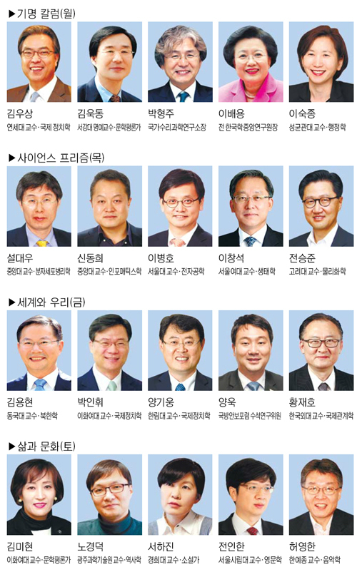 [알립니다] 오피니언 필진이 바뀝니다 입력 : 2017-01-30 18:14:19 수정 : 2017-01-30 18:14:19 구글 네이버 유튜브 세계일보 오피니언면 외부 필진이 내달 1일부터 바뀝니다. 새 논객이 펼치는 ‘기명 칼럼’ ‘사이언스 프리즘’ ‘세계와 우리’ ‘삶과 문화’와 ‘곽금주의 심리 카페’는 국내외 현안에 대한 깊이 있는 분석과 향기 가득한 이야기로 독자 여러분의 삶을 풍요롭게 해드릴 것입니다. 변함없는 성원을 부탁드립니다. 〈가나다 순〉 클릭하면 큰 그림으로 볼 수 있습니다. Copyright ⓒ 세계일보. 무단 전재 및 재배포 금지 세계일보