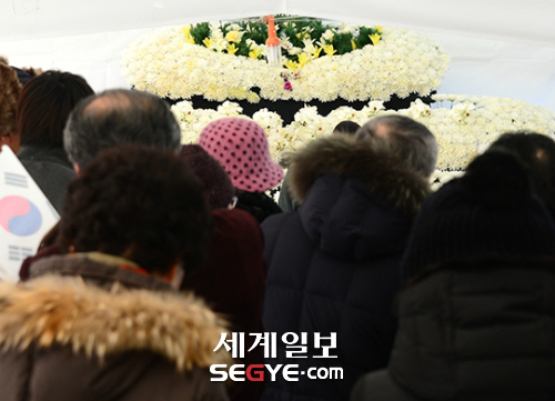 시민들이 31일 오후 서울 중구 태평로 서울광장에서 보수단체 ‘대통령 탄핵기각을 위한 국민 총궐기 운동본부’ 회원들이 마련한 추모 분향소를 찾아 조문하고 있다. 이 분향소는 지난 28일 ‘탄핵 반대’라고 적힌 태극기를 손에 들고 투신한 ‘박사모’(박근혜를사랑하는 모임) 회원인 조모(61)씨를 기리기 위해 차려졌다.