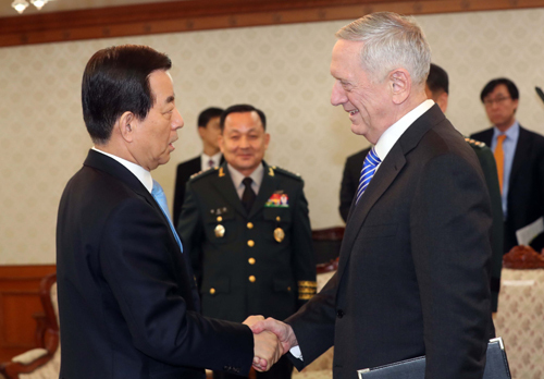 | 한민구 국방부 장관(왼쪽)이 2일 서울 종로구 세종로 정부서울청사에서 황교안 대통령 권한대행을 예방하기 위해 찾은 제임스 매티스 미국 국방부 장관과 악수하고 있다. 청와대 사진기자단 |