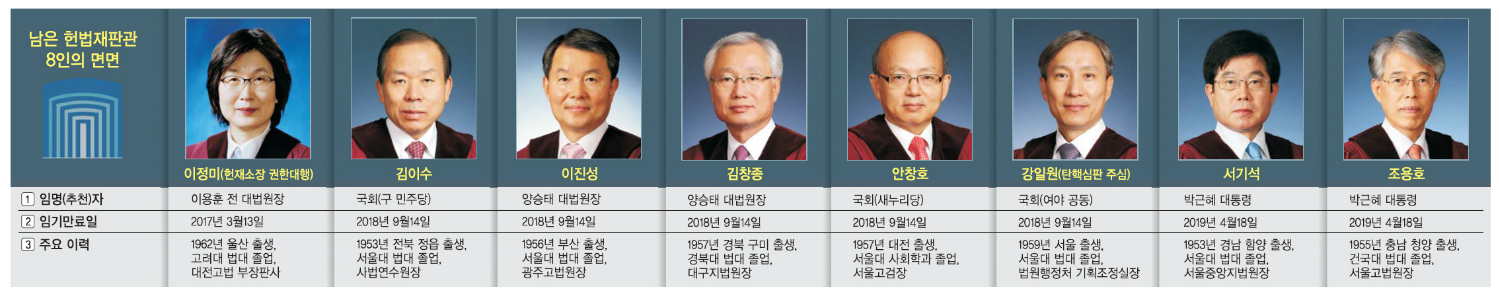 오는 3월13일 퇴임하는 이정미 헌법재판소장 권한대행 후임자가 아직 결정되지 않은 만큼 자칫 재판관 숫자가 7명으로 줄어들 수도 있기 때문이다. 법조계 안팎에서는 박한철 전 헌재소장 후임자도 못 정한 상황에서 이 재판관마저 물러나면 탄핵심판을 비롯한 헌재 운영 전반에 큰 차질이 빚어질 수 있다는 우려가 나온다.