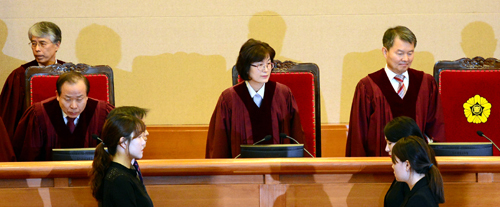 | 헌법재판소가 박근혜 대통령 탄핵심판 12차 변론을 연 9일 이정미 헌재소장 권한대행(가운데) 등 재판관들이 헌재 대심판정에 입장하고 있다. 사진공동취재단 |