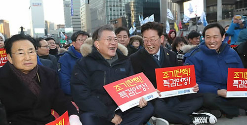 선두 대권주자인 더불어민주당 문재인 전 대표는 이날 다시 '촛불'을 들고 당원, 의원들과 함께 광화문 광장에 섰다. 박 대통령 측이 탄핵심판 지연을 도모하며 일각에서 탄핵기각설이 제기되고 있는 상황에서 탄핵정국의 동력을 살려 나가는데 전력 투구하는 모습이다. 문 전 대표는 촛불집회가 끝난 후 기자들과 만나 “대통령의 조속한 탄핵을 바라는 국민의 마음이 다시 광화문에 모였다”며 “조속한 탄핵을 바라는 많은 국민의 염원들, 간절한 마음을 헌재가 잘 받들어주리라 믿는다”고 말했다. 문 전 대표는 또 “박 대통령이 검찰수사 거부에 이어 특검 수사까지 거부하고 나선 건 결코 용납할 수 없는 일”이라며 “국가 지도자로서 있을 수 없는 태도”라고 지적했다. 문 전 대표는 이날 오전에는 여권의 텃밭인 TK(대구·경북)의 심장부인 대구로 내려가 ‘탄핵투쟁’을 외쳤다.