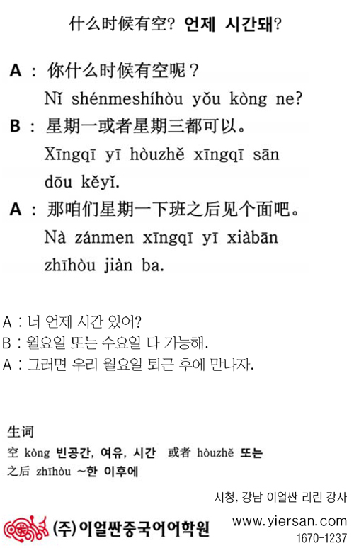 [이얼싼 중국어 회화] 언제 시간돼? 입력 : 2017-02-14 20:48:14 수정 : 2017-02-14 20:48:10 구글 네이버 유튜브 Copyright ⓒ 세계일보. 무단 전재 및 재배포 금지 세계일보 김남길