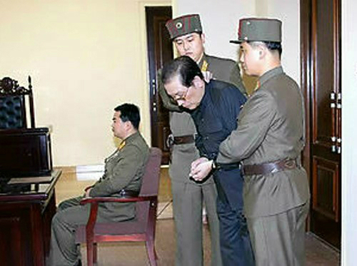 | 북한 매체가 공개한 장성택 전 국방위원회 부위원장의 재판 당시 모습. 북한은 국가안전보위부 특별군사재판을 열어 장성택에게 ‘국가전복음모의 극악한 범죄’로 사형을 선고하고 이를 바로 집행했다. 양 손은 포승줄에 묶여있고 눈두덩이에 멍자국이 있다. 자료사진 |