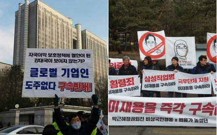 박 대통령 퇴진운동 측 시민들은 이날 영장심사가 열리기 전인 오전 10시쯤 법원 앞에서 ‘이재용 구속하라’고 적힌 현수막과 피켓을 들고 구호를 외쳤다. 법원 관계자들이 “피켓 들면 안 된다”며 제지하자는 과정에서 실랑이가 벌어지기도 했다.