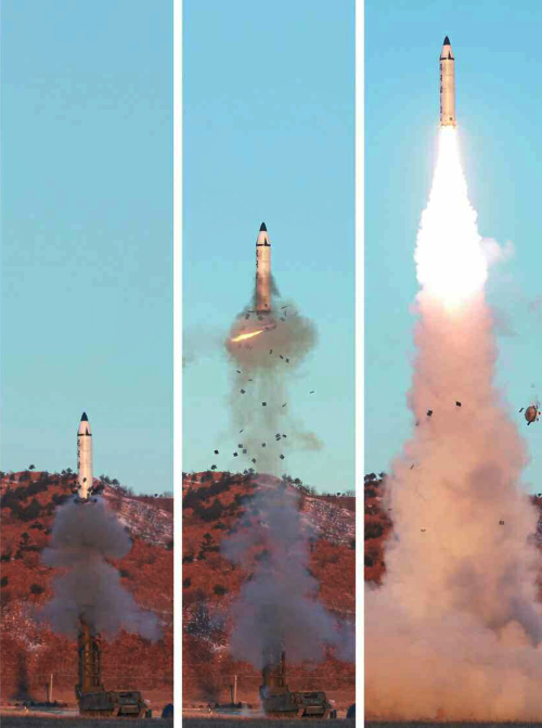 | 북한이 13일 노동당 기관지 노동신문을 통해 공개한 중장거리 탄도미사일 '북극성 2형'의 발사 장면. 북한 관영매체들은 이날 "지상대지상 중장거리 전략탄도탄 북극성 2형 시험발사가 2017년 2월 12일 성공적으로 진행됐다"고 보도했다. 노동신문 |