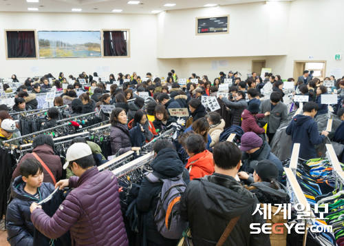 양천구녹색가게연합회 주관으로 24일 서울 양천구청 3층 양천홀에서 열린 ‘교복·학생용품 교환장터’는 옷을 고르는 인파로 발 디딜 틈이 없었다. 양천구청 제공