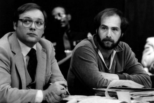 | 1977년 여대생 3명을 강간한 혐의 등으로 재판을 받고 있는 미국인 빌리 밀리건(오른쪽)과 그의 변호사 알란 골즈베리의 모습. 콜럼버스 디스패치 캡처 |