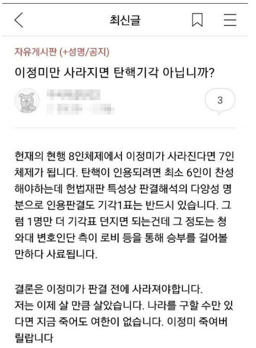 앞서는 이정미 헌재 재판관을 살해하겠다는 글이 ‘박근혜 대통령을 사랑하는 모임’(박사모) 온라인 카페에 올라오기도 했다. ‘이정미만 사라지면 탄핵 기각 아니냐’는 제목의 이 글은 “이정미가 판결 전에 사라져야 한다. 나는 이제 살 만큼 살았으니 나라를 구할 수만 있다면 지금죽어도 여한이 없다”는 내용을 담고있었다. 다행히 이 글을 올린 최모(25)씨가 경찰 수사에 심적 부담을 느껴 25일 자수했지만, 테러 위협은 가시지 않고있다. 다른 헌재 재판관들과 박영수 특별검사 역시 경찰 경호를 받고있다.