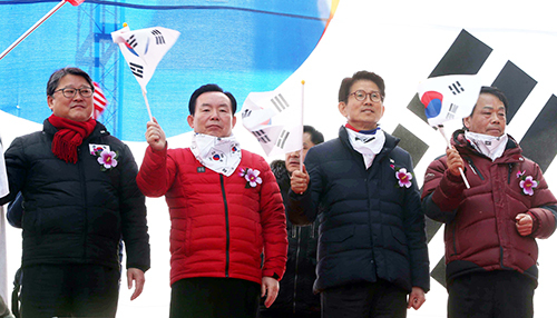 | 대구 집회 찾은 與 주자들 자유한국당 이인제 전 최고위원(왼쪽 두 번째), 김문수 비대위원(세 번째) 등이 26일 오후 대구 중구 중앙로에서 열린 탄핵기각총궐기 대회에서 태극기를 흔들고 있다. 왼쪽부터 조원진 의원, 이 전 최고위원, 김 비대위원, 이완영 의원. 대구=연합뉴스 |