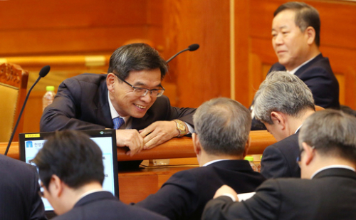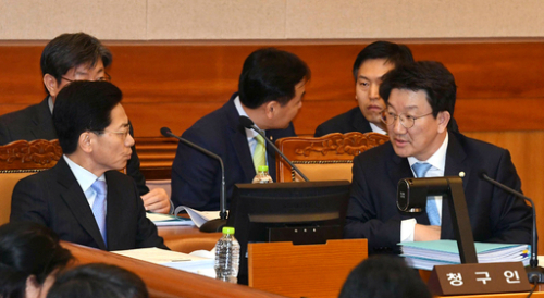 | 뚫어야 … 27일 헌법재판소 대심판정에서 박근혜 대통령 탄핵심판 최종변론이 시작되기 전 소추위원인 권성동 국회 법사위원장(오른쪽)이 탄핵소추위원단 관계자들과 얘기를 나누고 있다. 사진공동취재단 |