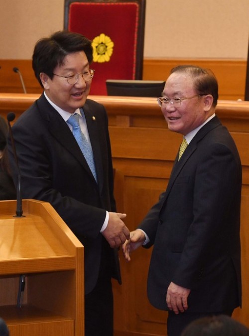 | 27일 서울 종로구 재동 헌법재판소에서 열린 박근혜 대통령 탄핵심판 최종 변론에 앞서 국회 탄핵소추위원장인 권성동(왼쪽) 법사위원장과 박근혜 대통령 측 법률대리인단의 이동흡 변호사가 악수하고 있다. 사진공동취재단 |