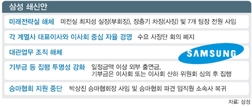 삼성은 28일 오후 특별검사팀이 공식 활동을 종료하며 이 부회장과 최지성 미전실 실장(부회장) 등 삼성 수뇌부 5명을 기소한 직후 미리 준비한 쇄신안을 발표했다.