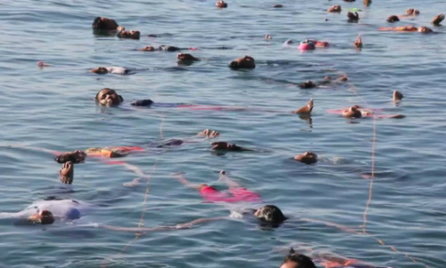 | 잎새뜨기 생존술을 시연 중인 어린이와 청소년들. 숨을 크게 들이마셔 몸의 부력을 최대한 크게 한 뒤 힘을 빼고 물속에서 양팔을 넓게 벌린 자세로 체력을 유지하면서 구조를 기다리면 된다. |