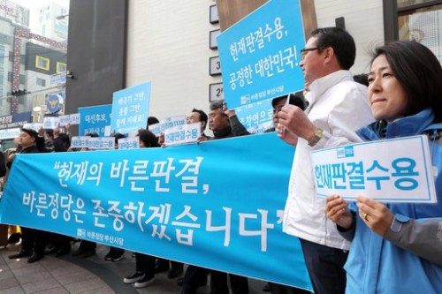 | 바른정당 부산시당 당원들이 1일 오후 부산 중구 남포동 피프광장에서 헌법재판소 탄핵 심판 결정을 수용하자고 촉구하는 ‘국가안정기원 캠페인’을 벌이고 있다. 부산=연합뉴스 |