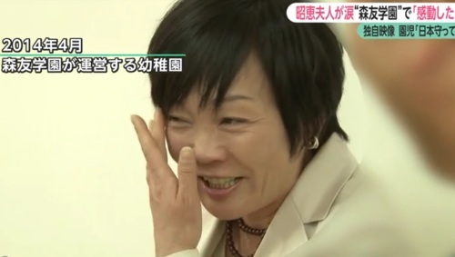 | 극우 교육을 하는 유치원의 원생들이 “아베 총리를 열심히 지원하라”고 말하자 “감동했다”며 눈물을 보이는 아키에 여사. FNN캡처 |