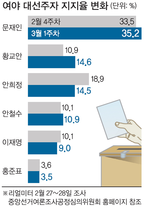 리얼미터가 지난달 2월 27, 28일 동안 실시해 이날 발표한 3월 1주차 정례 여론조사(중앙선거여론조사공정심의위원회 홈페이지 참조)에서 안 지사는 4.4%포인트 하락한 14.5%로 2위 자리를 황교안 대통령 권한대행(14.6%)에 내줬다.