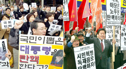| 탄핵 지지자들이 서울 여의도 국회 앞에서 '야당은 노무현 탄핵하라'는 피켓을 틀고 탄핵 지지 집회를 벌이고 있다. 자료사진 |