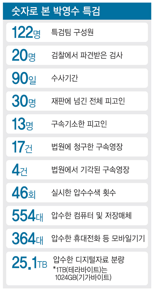 6일 오후 1시 58분쯤 한 카메라 기자가 외치자 서울 대치동 특검사무실 14층 브리핑실에 앉아 있던 취재진의 눈이 일제히 출입구로 향했다. 브리핑실은 오후 1시쯤부터 취재진이 300명 가까이 몰려들어 발 디딜 틈이 없었다. 순간 박영수(65·사법연수원 10기) 특별검사가 소나기처럼 퍼붓는 카메라 플래시를 온몸으로 맞으며 성큼성큼 들어섰다. 한 손에는 수사팀이 지난 90일간 밤낮없이 수사한 결과물의 요약자료가 담긴 파일이 들려있었다. 박충근·이용복·양재식·이규철 특검보, 윤석열 수사팀장, 어방용 수사지원단장이 뒤따랐다.