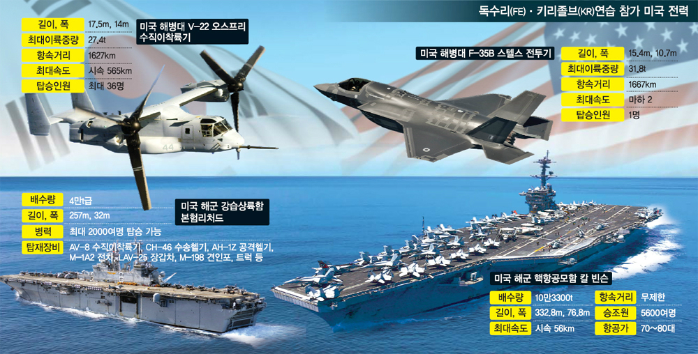 과거보다 월등한 규모의 미국 첨단 전략자산의 한반도 전개도 점쳐진다. 15일 미국 핵 항공모함 칼빈슨호(9만3000t급)의 부산항 입항을 시작으로 일본 야마구치(山口)현 이와쿠니(岩國)에 배치된 F-35B 스텔스 전투기도 이달 중 처음으로 훈련에 참가한다. 북한 핵심 군사시설과 요인 제거를 위한 참수작전 훈련을 펼칠 가능성이 크다. 핵과 재래식 타격이 가능한 B-2 스텔스 폭격기와 B-52 전략폭격기 역시 투입이 예정돼 있다. 다음달에는 경북 포항 일대에서 북한 후방 침투를 가정해 한·미 해군과 해병대가 참가하는 대규모 상륙훈련이 실시된다. 미국 해군의 4만1000t급 강습상륙함(LHD) 본험리처드함을 비롯한 다수의 상륙함과 V-22 오스프리 수직이착륙기 등도 참가전력으로 꼽힌다.