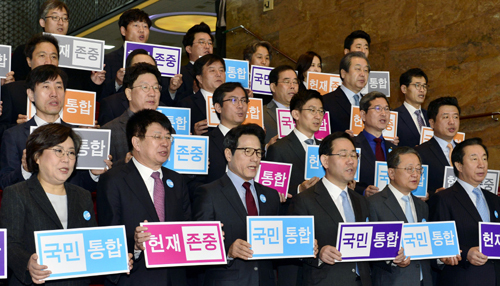 | “헌재 결정 존중하겠습니다” 정병국 대표(앞줄 왼쪽 두번째) 등 바른정당 의원들이 7일 오전 국회에서 비상시국 의원총회를 마친 뒤 헌법재판소의 탄핵심판 결정을 존중하겠다는 의미로 ‘헌재 존중’과 ‘국민통합’을 외치고 있다. 이재문 기자 |
