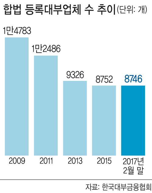 9일 한국대부금융협회에 따르면 불법 대부업체 명칭을 보고 합법업체로 착각해 돈을 빌린 후 피해 사례를 상담하는 신고전화가 급증하고 있다. 최근 들어 합법적 대부 시장 규모가 줄어드는 반면 불법 사금융 시장이 팽창하고 있기 때문이다. 2009년 1만4783개였던 등록 대부업체는 2016년 말 현재 40% 가까이 줄었다. 정확한 규모는 파악하기 힘들지만 한국갤럽의 조사 결과에 따르면 불법 사금융 이용 총액은 2015년 약 10조5897억원에서 1년 만에 24조1144억원으로 상승한 것으로 추정됐다. 불법 업체들은 합법 업체들의 상호뿐 아니라 광고전략까지 베끼고 있는 실정이어서 1, 2금융권 대출을 받기 힘든 소비자들이 불법 사금융의 덫에 속속 걸려들고 있다.
