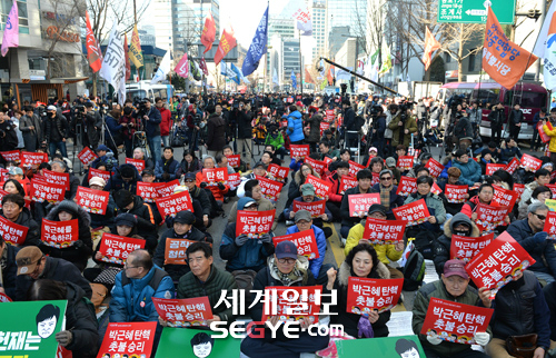 [포토] '박근혜 탄핵 촛불 승리' 입력 : 2017-03-10 10:37:09 수정 : 2017-03-10 10:37:08 구글 네이버 유튜브 박근혜 대통령의 탄핵심판 선고일인 10일 오전 서울 종로구 헌법재판소 인근에서 시민들이 박 대통령의 탄핵에 찬성하는 집회에 참석해 구호를 외치고 있다. 한윤종 기자 hyj0709@segye.com Copyright ⓒ 세계일보. 무단 전재 및 재배포 금지 세계닷컴 한윤종