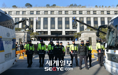 [포토] 헌법재판소 지키는 경찰 입력 : 2017-03-10 10:39:54 수정 : 2017-03-10 10:49:40 구글 네이버 유튜브 박근혜 대통령 탄핵심판 선고일인 10일 오전 서울 종로구 헌법재판소 입구에서 경찰이 차벽을 세우고 경계근무를 강화하고 있다. 한윤종 기자 hyj0709@segye.com Copyright ⓒ 세계일보. 무단 전재 및 재배포 금지 세계닷컴 한윤종