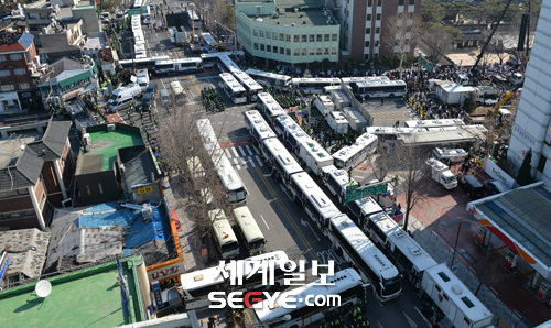 [포토] 경찰 버스로 가득 찬 헌재 주변 입력 : 2017-03-10 10:52:47 수정 : 2017-03-11 23:59:02 구글 네이버 유튜브 박근혜 대통령에 대한 탄핵 심판 최종 선고일인 10일 오전 서울 종로구 안국역 사거리 일대의 헌법재판소로 향하는 도로에 경찰의 차벽이 설치되어 있다. 한윤종 기자 hyj0709@segye.com Copyright ⓒ 세계일보. 무단 전재 및 재배포 금지 세계닷컴 한윤종