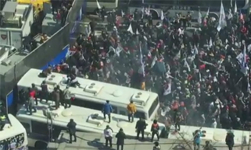 [포토] 차벽 넘은 박 전 대통령 탄핵 반대 시위대 입력 : 2017-03-10 12:26:01 수정 : 2017-03-10 13:25:31 구글 네이버 유튜브 박근혜 전 대통령의 탄핵을 반대하는 시위대가 차벽을 넘어 헌재 앞으로 이동을 시도하고 있다. 일부는 경찰과 마찰을 빚기도 했다. 또 일부는 경찰에 연행됐다. 사진·글= 김동환 기자 영상=시민 김지언씨 제보 영상=김경호 기자 Copyright ⓒ 세계일보. 무단 전재 및 재배포 금지 Cube 김동환