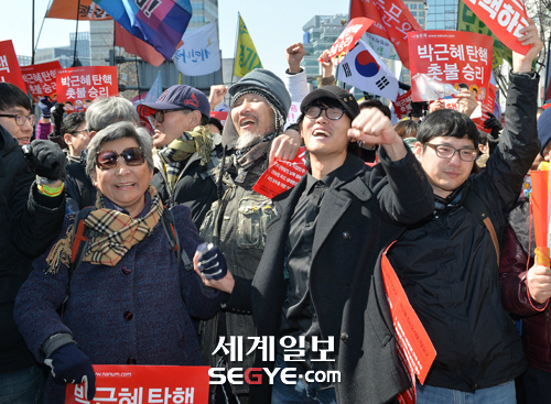 [포토] '탄핵 인용' 시민들 만세! 입력 : 2017-03-10 12:31:03 수정 : 2017-03-11 23:02:56 구글 네이버 유튜브 10일 서울 종로구 헌법재판소 앞 안국역 일대에서 생중계로 헌재의 박근혜 대통령에 대한 탄핵심판 선고를 지켜보던 '박근혜정권퇴진비상국민행동' 측 시민들이 인용 결정에 환호하고 있다. 한윤종 기자 hyj0709@segye.com Copyright ⓒ 세계일보. 무단 전재 및 재배포 금지 세계닷컴 한윤종