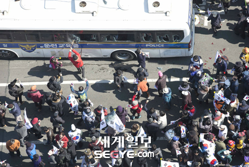 [포토] 경찰 버스 부수는 보수 단체들 입력 : 2017-03-10 14:01:55 수정 : 2017-03-11 22:18:49 구글 네이버 유튜브 10일 오후 서울 종로구 재동 헌법재판소 앞에서 박근혜 대통령의 탄핵이 인용된 데 항의하는 보수단체 회원들이 차벽을 부수고 헌재 방향으로 진입하고 있다. 한윤종 기자 hyj0709@segye.com <사진공동취재단> Copyright ⓒ 세계일보. 무단 전재 및 재배포 금지 세계닷컴 한윤종