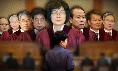 2017년 3월10일 오전 11시21분 이정미 헌법재판소장 권한대행이 ‘역사적인 심판’의 마침표를 찍었다. 순간 헌재 심판정은 대통령과 국회 측 대리인, 일반 방청객, 취재진 등이 가슴속으로 내뱉는 환호와 탄식이 교차했다. 92일간 온 국민의 이목이 쏠렸던 박근혜 전 대통령 탄핵심판 결과가 나온 데는 18분밖에 걸리지 않았다.