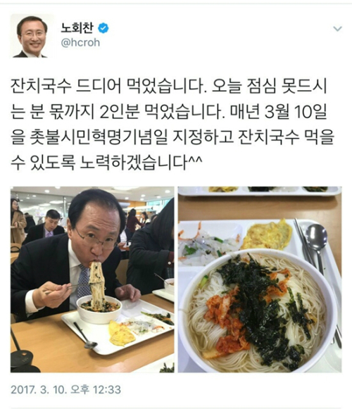 이에 정의당 노회찬 의원은 자신의 트위터를 통해 "매년 3월 10일을 촛불 시민 혁명 기념일로 지정하고 잔치국수를 먹을 수 있도록 노력하겠다"고 위트있는 소감을 남겨 웃음을 자아냈다.