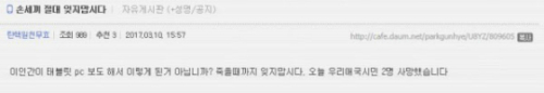 해당 글에서 박사모 회원은 “이 인간이 태블릿 PC 보도해서 이렇게 된 거 아니냐”며 “죽을 때까지 잊지 말자. 오늘 우리 애국시민 2명 사망했다”라고 말했다.