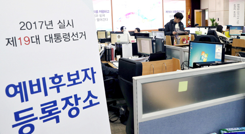 | 선관위, 대선종합상황실 가동 13일 과천 중앙선거관리위원회 대선 종합상황실에서 지난 10일부터 제19대 대선 예비후보자 등록을 받고 있는 선관위 직원들이 업무를 보고 있다. 중앙선관위는 이날 긴급 전체 위원회를 열고 “선거절차를 공정하고 안정적으로 진행하고 국민 투표 참여를 높이기 위해 선거일이 최대한 빨리 확정돼야 한다”고 밝혔다. 연합뉴스 |
