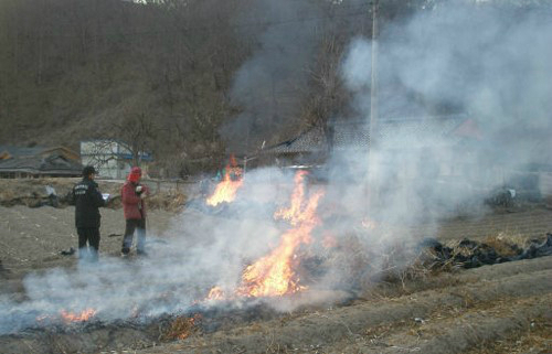 | 산불감시원이 농촌지역의 쓰레기 소각현장을 단속하고 있다. 자료사진 |