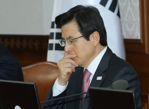 | 박근혜 대통령 탄핵 결정 후 처음 열린 국무회의에서 황교안 대통령 권한 대행이 모두 발언을 마친 후 취재진이 나가길 기다리고 있다. 청와대사진기자단 |
