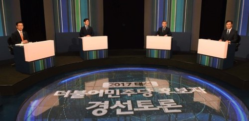정책 토론은 이 시장의 기본소득 공약을 중심으로 이뤄졌다. 문 전 대표는 “국민 1인당 연간 100만원을 지급하자는 이 시장 기본소득 공약에 43조원이 투입된다”며 “이는 국방예산보다 더 많은 돈으로, 19%가 안되는 조세부담률을 22% 수준으로 올려야 감당할 수 있다”고 지적했다. 안 지사 역시 “43조원 규모라면 노인복지·보육 등 다른 분야에 투입하는 게 더 나을 수 있다”고 비판했다. 이 시장은 “국가예산 400조원 중 대통령 재량으로 배분할 수 있는 예산이 142조원이다. 토목예산에 쓸 거냐, 자원비리외교에 쓸 거냐 선택하는 것인데 7% 부담이어서, (공약을 실천)할 수 있다”고 주장했다.