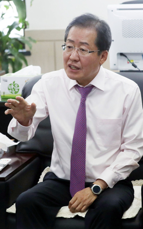 | 자신감 붙은 洪 자유한국당 홍준표 경선후보가 16일 오전 서울 여의도 경남도청 서울사무소 사무실에서 지방 언론사 합동 인터뷰를 하고 있다. 홍 후보는 황교안 대통령 권한대행의 불출마로 범여권에서 가장 지지율이 높은 유력 대선주자로 부상했다. 연합뉴스 |