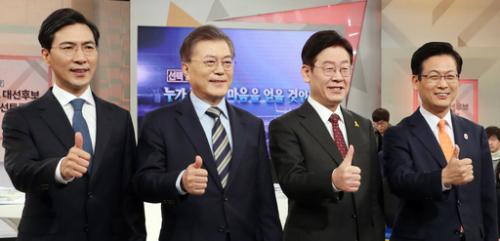 반환점 돈 토론회 입력 : 2017-03-19 18:34:45 수정 : 2017-03-19 18:34:45 구글 네이버 유튜브 더불어민주당 대선 경선후보들이 19일 서울 영등포구 여의도 KBS 스튜디오에서 열린 합동토론회에 앞서 엄지손가락을 들어올리며 포즈를 취하고 있다. 왼쪽부터 안희정, 문재인, 이재명, 최성 후보. 국회사진기자단 Copyright ⓒ 세계일보. 무단 전재 및 재배포 금지 세계일보 남상훈