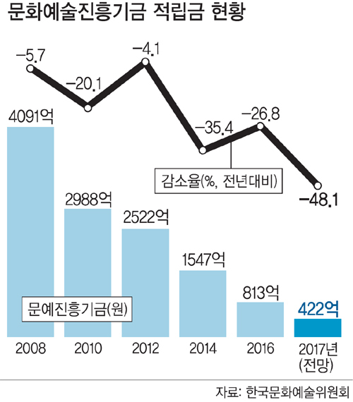 20일 문화체육관광부와 한국문화예술위원회에 따르면 문예기금 잔액은 올해 연말 422억원으로 줄어들어 추가 재원이 투입되지 않으면 내년에는 잔액이 고갈될 것으로 전망된다.